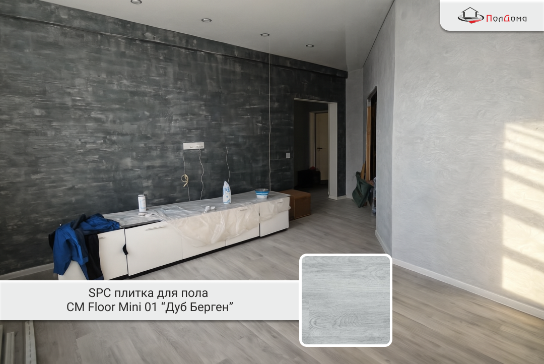 Стояла задача сделать ремонт пола — надёжно, красиво и на долгие годы. Клиент решил уложить покрытие самостоятельно и выбрал SPC-плитку CM Floor Mini 01 в декоре «Дуб Берген». Общая площадь работ — 40 м².